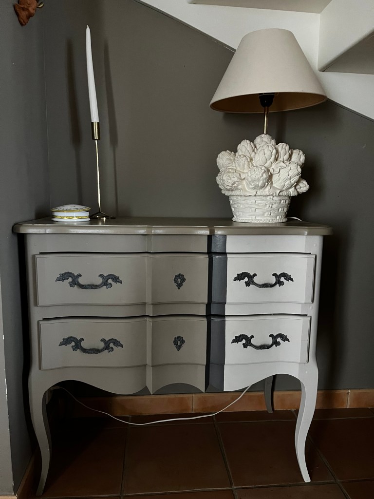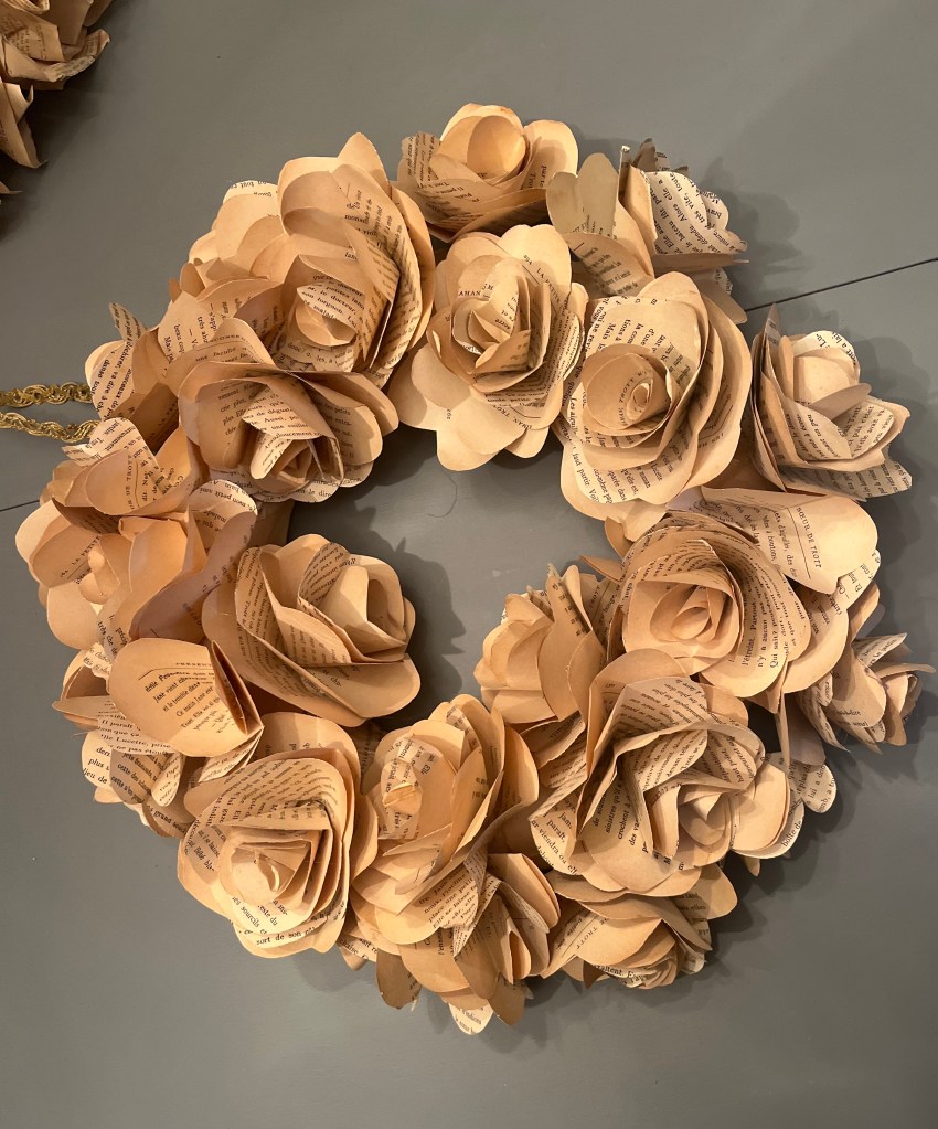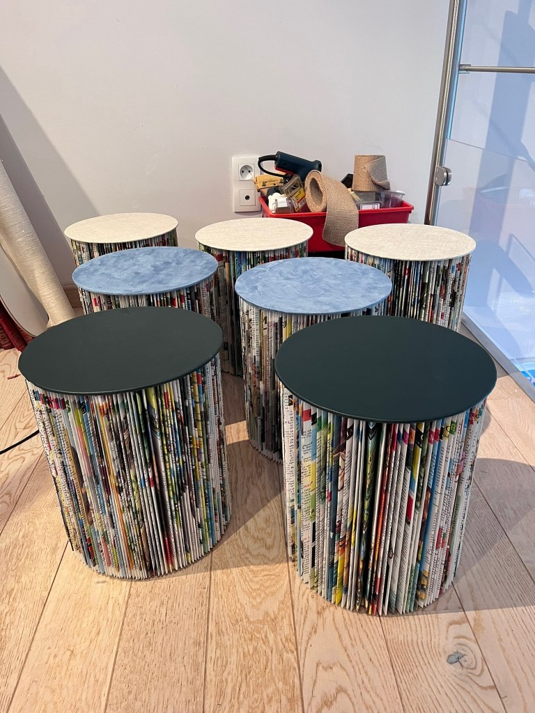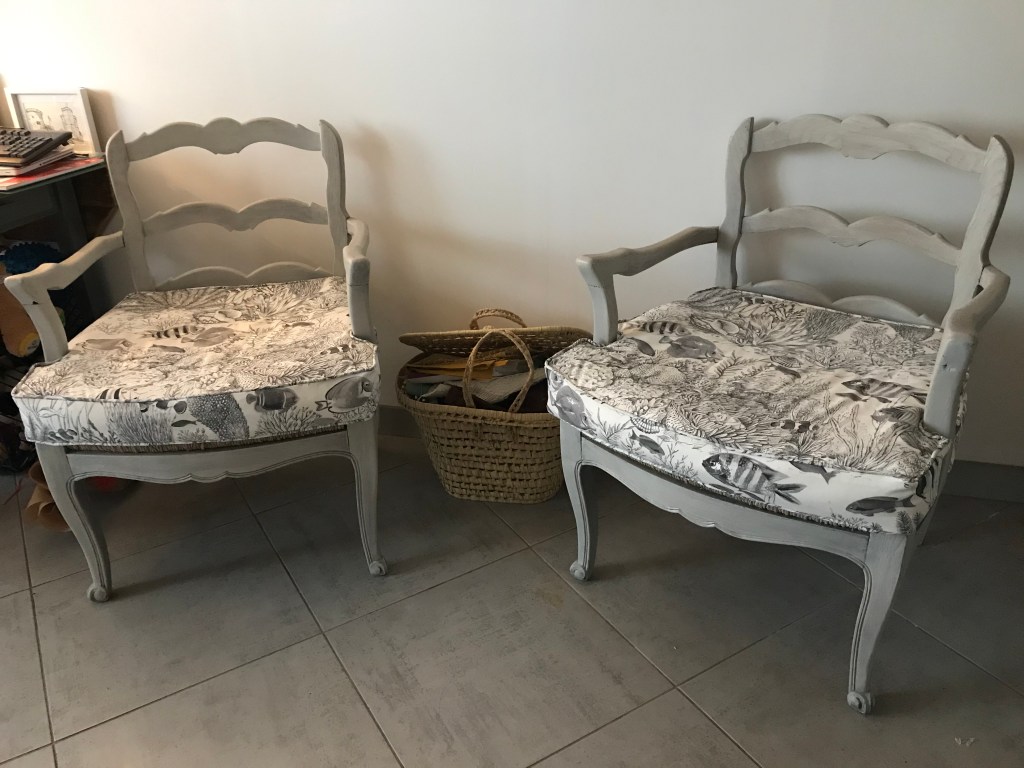 Couronne de fleur créée à base de vieux livresRecyclage d’encyclopédie en table d’appointCommode repeinte pour mieux l’intégrer dans la décoration globale de la pèceDesserte décapée et vernis matTabouret des années 70 repulpéTête de lit recouverte d’un beau tissus basqueFauteuils repeints et réalisation de coussins d’assisecréation avec bois flottéCréation d’une tête de lit en lin